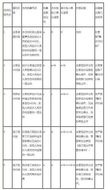 設(shè)計(jì)公司的主要業(yè)務(wù)為建筑設(shè)計(jì)業(yè)務(wù),在完成合同約定的階段性履約義務(wù),向客戶(hù)提交設(shè)計(jì)成果并取得成果確認(rèn)文件時(shí),根據(jù)合同約定的對(duì)應(yīng)履約階段金額確認(rèn)收入。但在方案階段結(jié)束轉(zhuǎn)施工圖階段并正式開(kāi)展后才簽訂設(shè)計(jì)合同的情況也存在,這時(shí)需要進(jìn)一步判斷該項(xiàng)目已發(fā)生成本費(fèi)用如何按照收入準(zhǔn)則進(jìn)行相應(yīng)的會(huì)計(jì)處理。如果設(shè)計(jì)公司根據(jù)實(shí)際情況判斷該項(xiàng)目最終能簽訂合同并獲得補(bǔ)償,則可按照新收入準(zhǔn)則的規(guī)定以合同履約成本來(lái)確認(rèn)在簽訂合同之前已經(jīng)發(fā)生的成本費(fèi)用。如果設(shè)計(jì)公司最終沒(méi)能與客戶(hù)簽訂合同,且前期發(fā)生成本不能得到任何補(bǔ)償,則需要將該項(xiàng)目發(fā)生的相關(guān)支出予以費(fèi)用化處理。 1、根據(jù)合同節(jié)點(diǎn)及其收款金額確認(rèn)分階段收入金額。本公司在業(yè)務(wù)承接階段收取的預(yù)收款項(xiàng),不確認(rèn)收入。